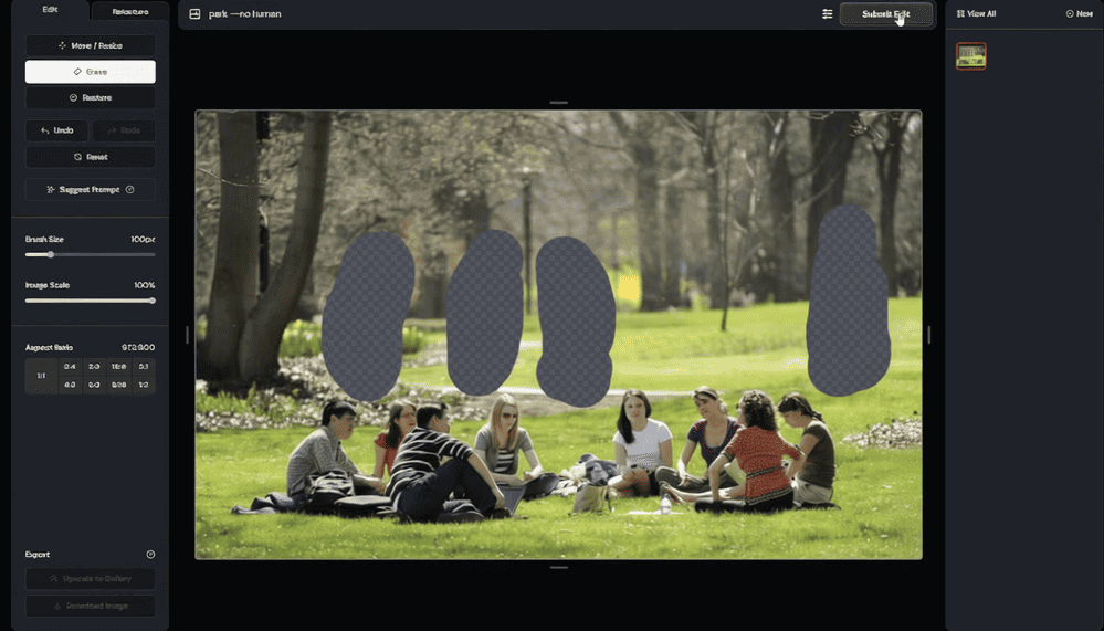 После загрузки изображения в редактор можно удалить объекты двумя способами: написать промпт в верхней строке или выделить ненужный элемент и нажать Erase. Оптимально сочетать оба метода — выделить объект и дополнительно указать промпт.