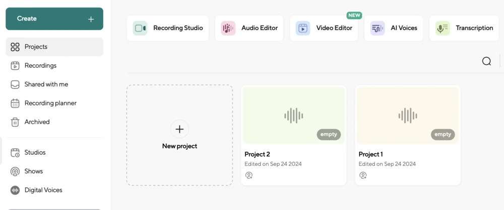 Podcastle больше подойдет для записи аудио- и видеоподкастов. В ИИ-сервисе можно создать свою студию записи, спланировать расписание съемок и выпусков. Студия доступна только в браузере Google Chrome или в мобильном приложении на iOS.
