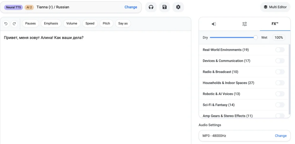 В Voicemaker при озвучке можно выбрать язык, акцент, пол диктора и задать стиль озвучки. Например, сделать голос похожим на инопланетянина или радиоведущего. Для точной настройки звучания можно регулировать интонацию и расставлять паузы.