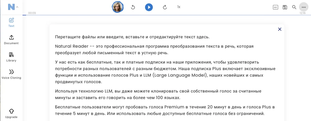 В отличие от многих аналогов, NaturalReader позволяет бесплатно клонировать свой голос и использовать его для озвучки на более чем 100 языках. Сервис дает возможность управлять звучанием: расставлять ударения, корректировать произношение слов и делать озвучку максимально естественной.