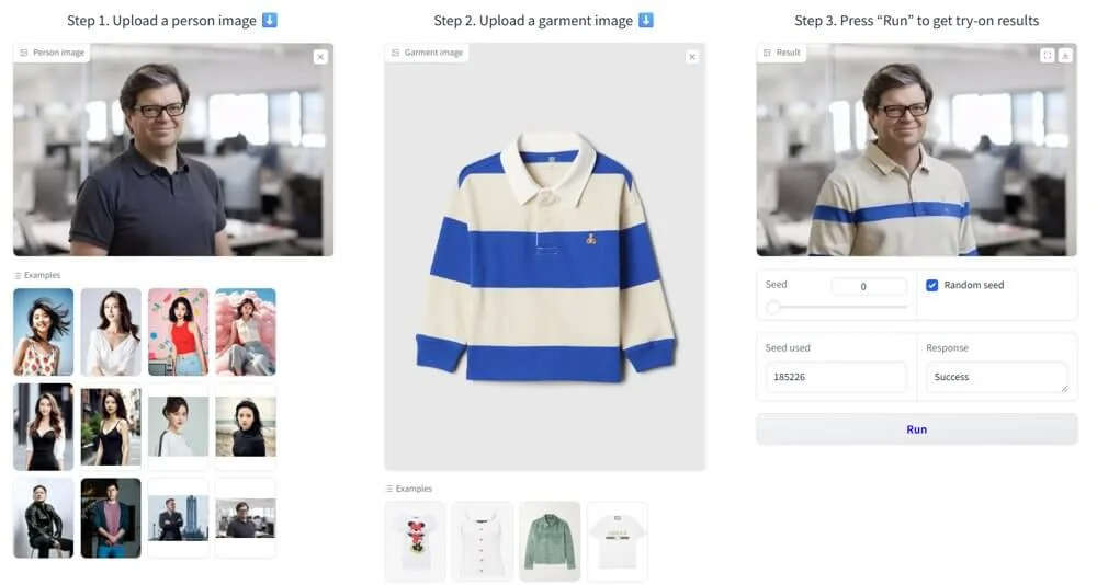 Kolors Virtual Try-On — модель на платформе Hugging Face. Работает просто: нужно загрузить фото персонажа, которого хотите переодеть, и картинку с новым образом. Затем нажать на кнопку Run — через минуту получите новый образ на изображении. При этом нейросеть сохраняет все детали.