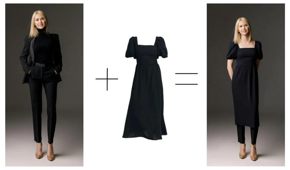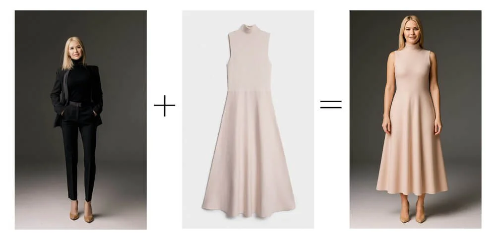 Nano Banana можно использовать как виртуальную примерочную: достаточно загрузить фото модели и выбранного наряда и составить промпт.