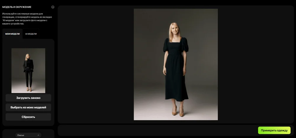 В инструменте «AI Примерка» вы можете загрузить фото, выбрать модель и одежду из предложенных или сгенерировать свой вариант.