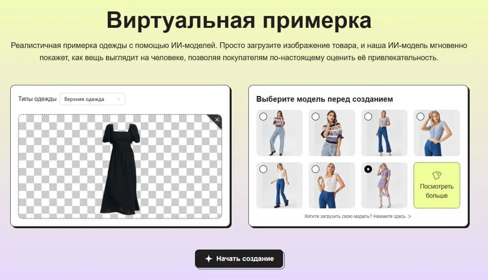 Выберите в сервисе инструмент Virtual Try On. Затем укажите тип одежды и загрузите картинку. Перед созданием изображений отметьте, какую модель использовать для генерации. Если хотите загрузить свою, нужно будет добавить отдельно — для этого понадобятся хорошие фото с разных ракурсов.