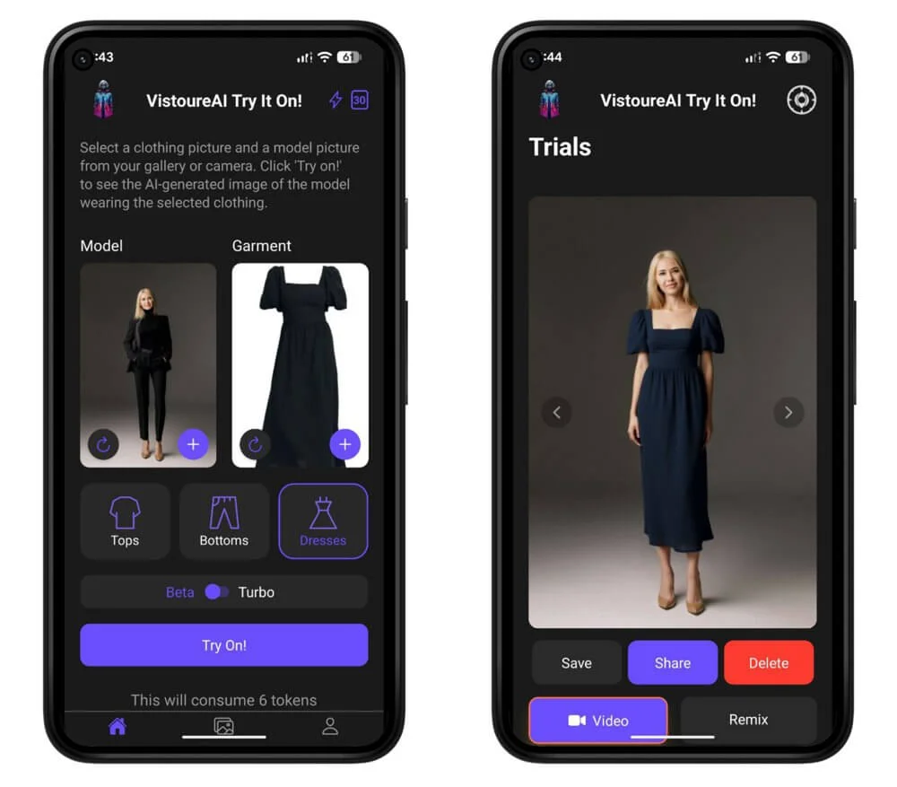 Когда пройдете регистрацию, на главном экране появятся окна загрузки фото: с моделью и предметом одежды. Выберите изображения и нажмите Try On! Через несколько секунд получите изображение с новым образом на модели.