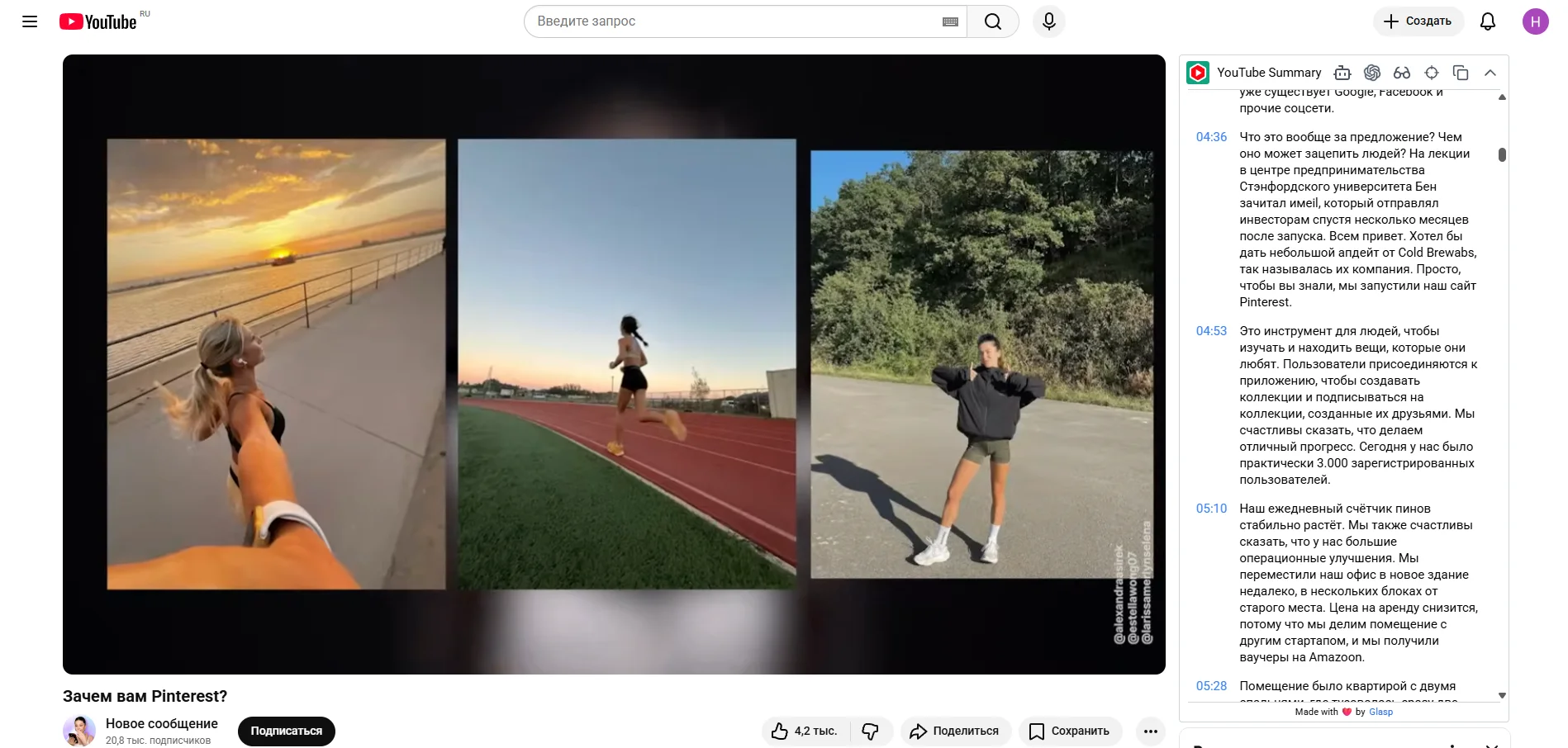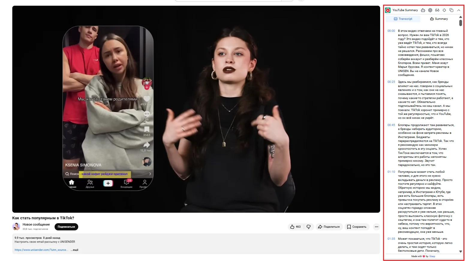 После установки расширения для браузера откройте YouTube-видео, из которого вы хотите получить главные мысли. Щелкните значок YouTube Summary на панели инструментов вашего браузера — оно сгенерирует саммари и предоставит возможность доступа к расшифровке видео.