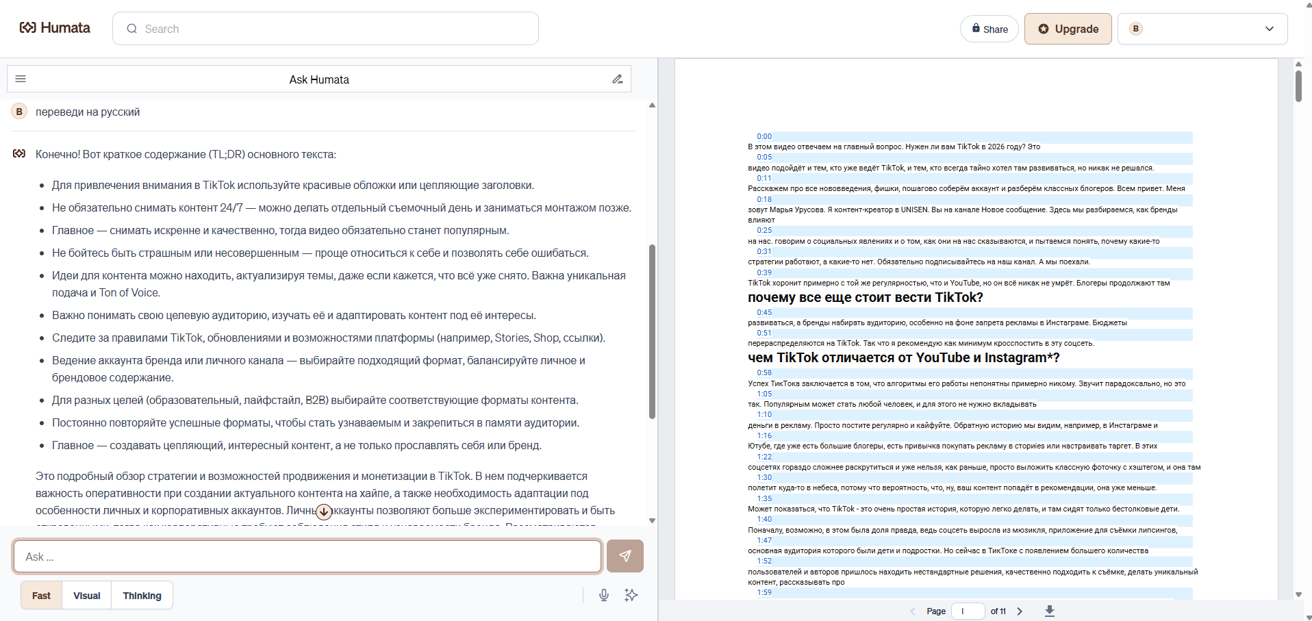 Вообще сервис отлично понимает русский язык, и ему можно задавать разные вопросы относительно текста. Humata позволяет сэкономить множество времени и ускорить процесс изучения документов и отчётов.