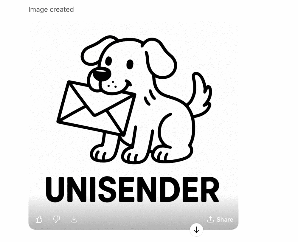 2. Запросите сам логотип. Для создания промпта используем идеи, которые прислала нейросеть. Мне понравилось изображение конверта + попросила добавить фирменные цвета ― фиолетовый и желтый ― и название сервиса Unisender.