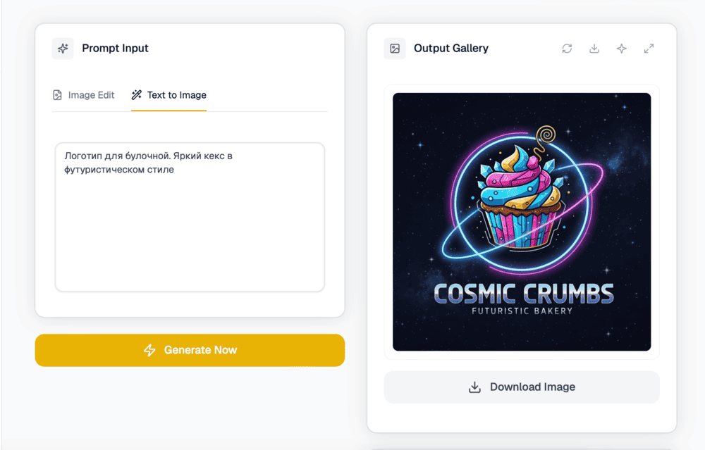Вот такой логотип получился по текстовому запросу. ИИ даже сам придумал название. Сервис хорошо справляется с генерацией текста, но только на английском языке. При этом сами запросы можно писать и по-русски — система понимает их.