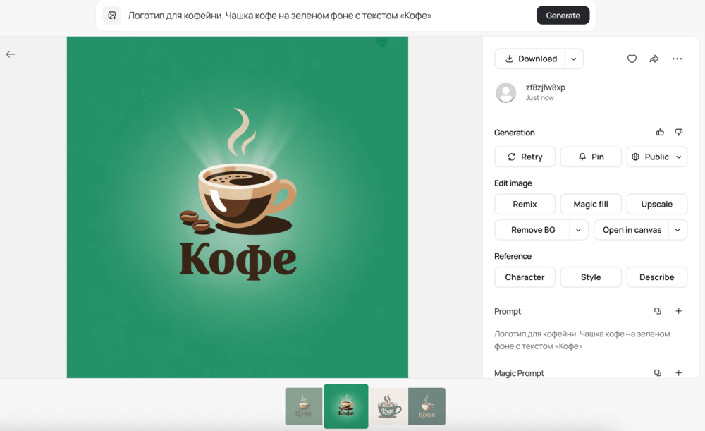 Чтобы создать логотип, напишите детальный промпт в строку ввода — ИИ создаст 4 варианта. Выберите тот, что понравился больше или измените запрос и сгенерируйте заново.