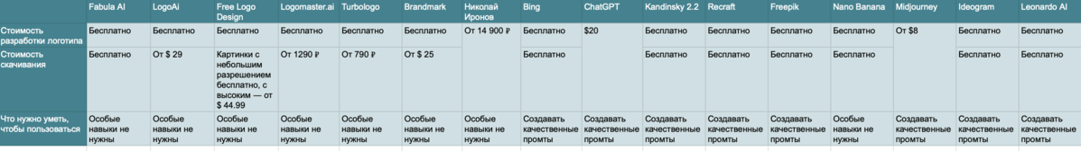 Чтобы на этапе создания логотипа было проще определиться с нейросетью, воспользуйтесь таблицей. Ссылка на Google Sheets.