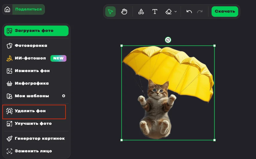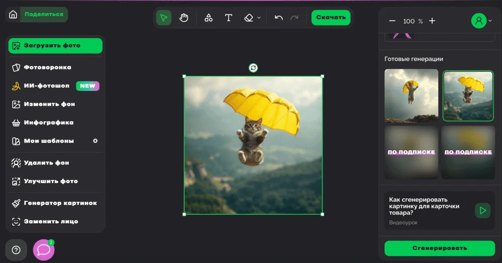 Удалить фон. Fabula автоматически анализирует картинку и удаляет задний фон. Работает быстро: загрузили фото → подождали 30 секунд → получили готовую генерацию в PNG-формате.