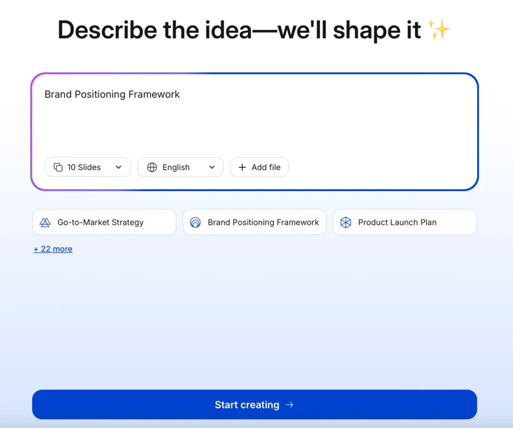 Чтобы сделать презентацию, нужно подготовить короткое описание в пару слов. Или можно отправить детальный план, в том числе с помощью файла (текстового документа до 50 страниц, Excel-таблицы, картинки, другой презентации в формате PPTX). Драфт можно отредактировать вместе с ИИ прямо на сайте, а готовый документ скачать в форматах PowerPoint и PDF.