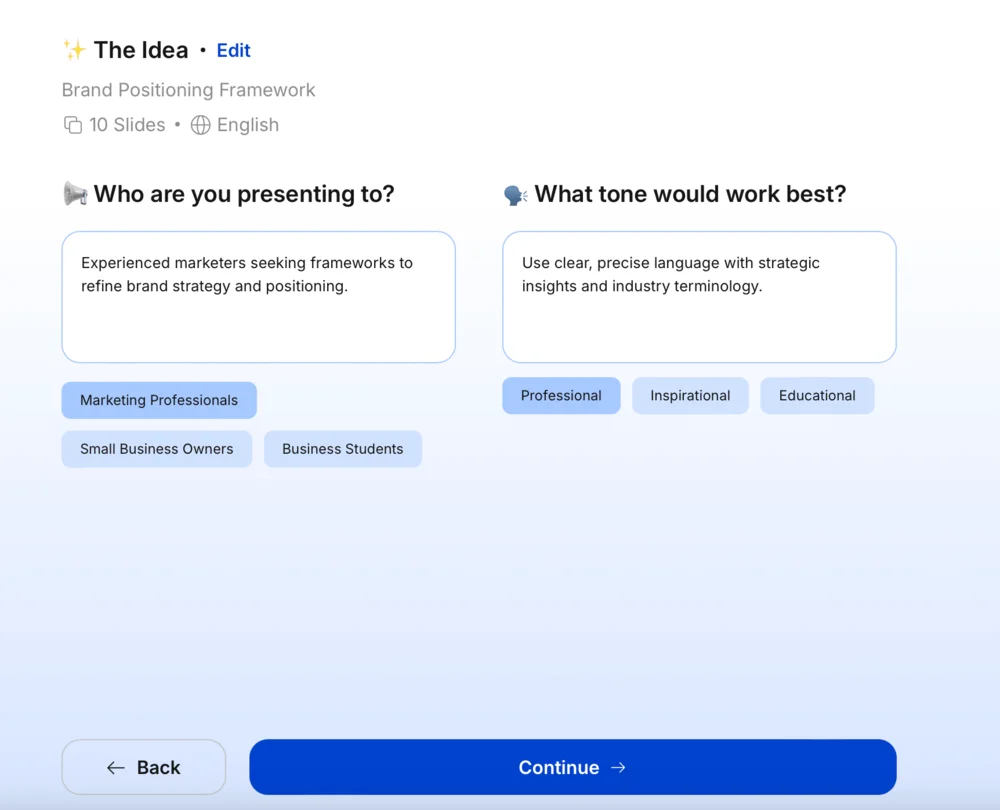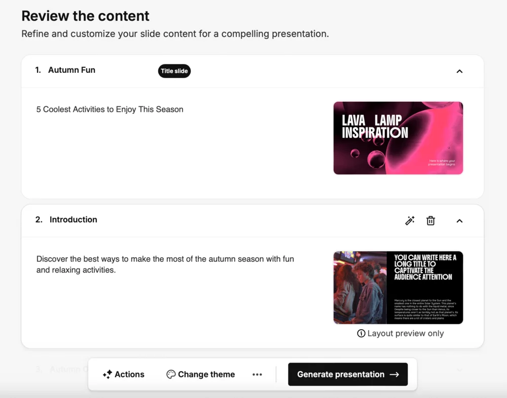 Так же как и в Gemma AI сервис сначала генерирует план для каждого слайда. Текст и стиль можно сразу отредактировать. Если все нравится, нажмите Generate presentation.