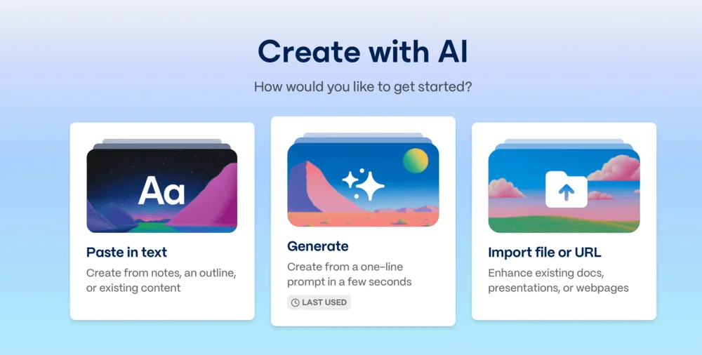 Также в сервис встроена нейросеть, которая умеет генерировать картинки по описанию. Вы можете создать презентацию с нуля (Generate), собрать ее на основе текста (Past in text) или файла (Import file or URL).