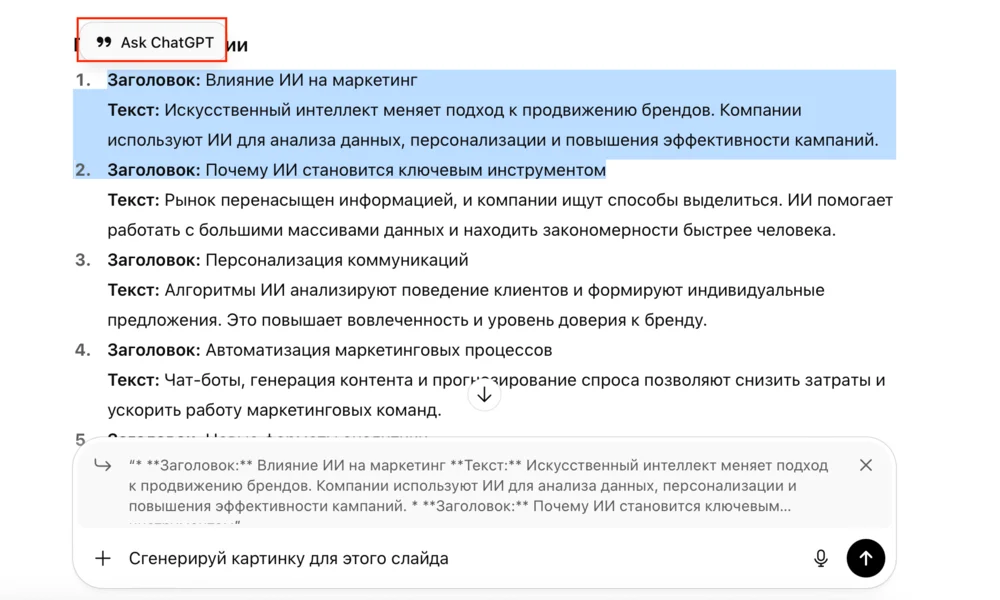 Чтобы подготовить изображения, выделите полностью заголовок и текст слайда, снова нажмите Ask ChatGPT и напишите «сгенерируйт картинку для этого слайда».