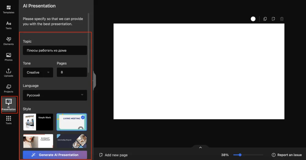 Чтобы создать презентацию по тексту с помощью нейросети, перейдите в раздел Designs → Create an Instagram* Post → AI Presentation. В Topic введите тему презентации на нужном языке, в разделе Tone выберите стиль повествования, в Pages укажите количество слайдов. Далее выберите язык и стиль презентации. Нажмите Create AI Presentation.