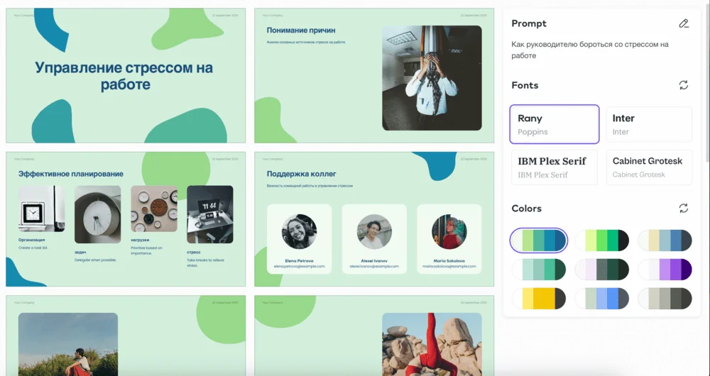 Это легко исправить. После генерации слайды можно доработать: изменить стиль, заменить текст и картинки.