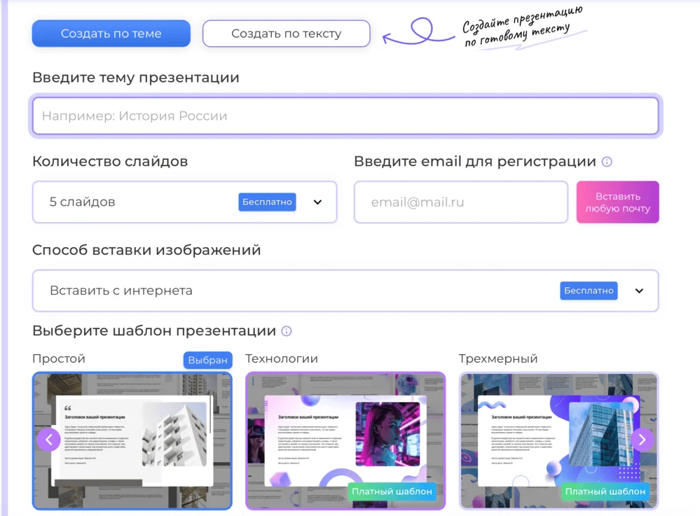 Стоимость. В бесплатной версии доступен базовый шаблон, максимум 5 слайдов и вставка картинок из интернета. После регистрации дают 3 токена на 3 презентации. Чтобы убрать все ограничения, надо оформить подписку за 99 ₽.