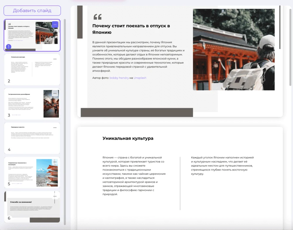 Бонусом в сервисе можно сгенерировать развернутый доклад для устного выступления. Примеры готовых презентаций есть на главной странице.