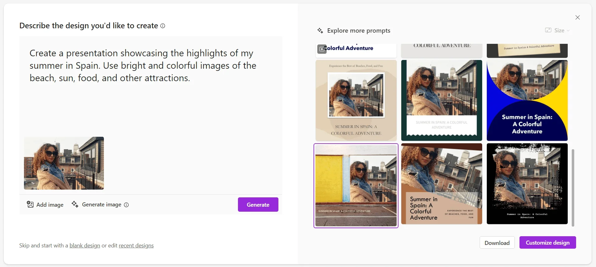 Microsoft Designer — это сервис от Microsoft, который помогает придумывать дизайны для будущих презентаций. Для этого нужно рассказать нейросети, о чём вы хотите сделать презентацию, а она подберёт фон, стилистику, стоковые фотографии и шрифты. Для этого в поле "Describe the design…" нужно написать, какой слайд вам нужен. Писать можно на русском, после первой генерации нейронка сама предложит наиболее подходящий промпт.