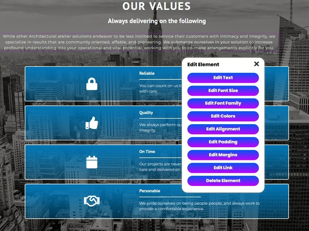 Чтобы исправить определенный элемент на сайте, кликните на него. Появится дополнительная панель инструментов с выбором: изменить цвет, текст или шрифт.