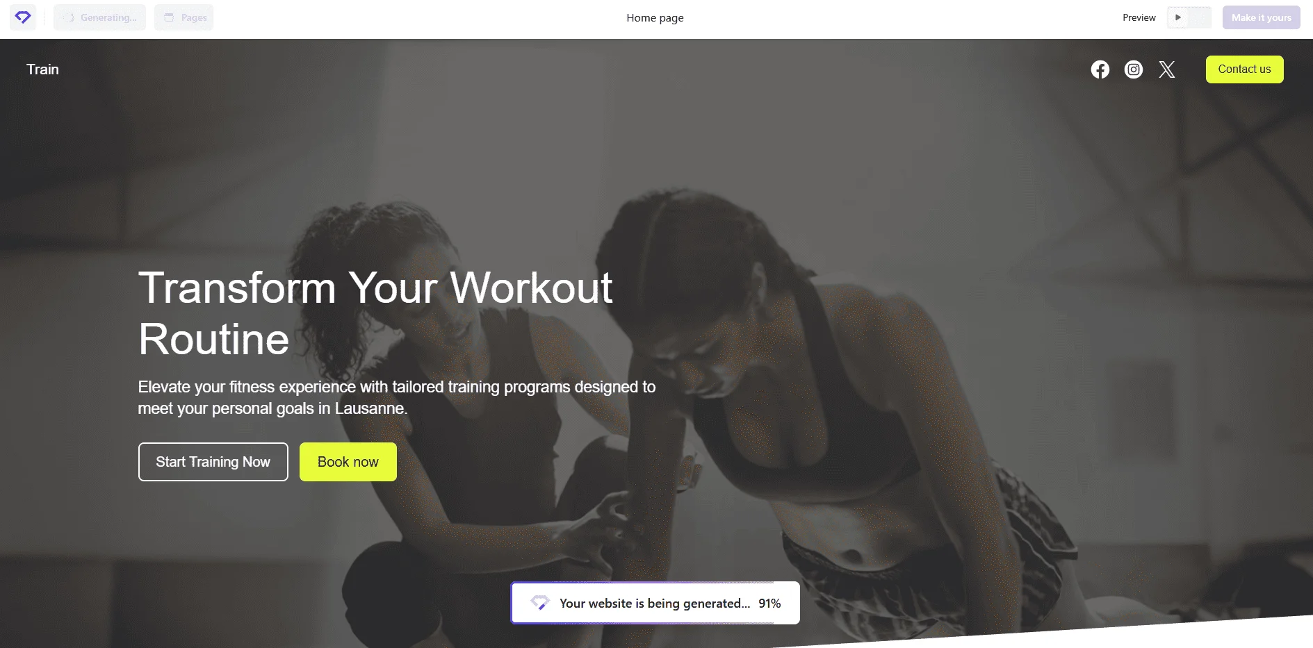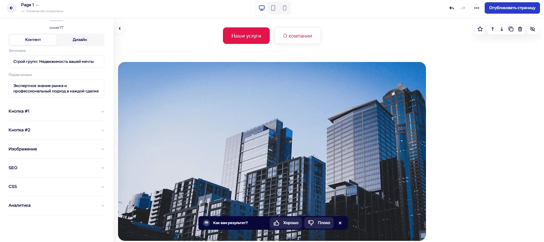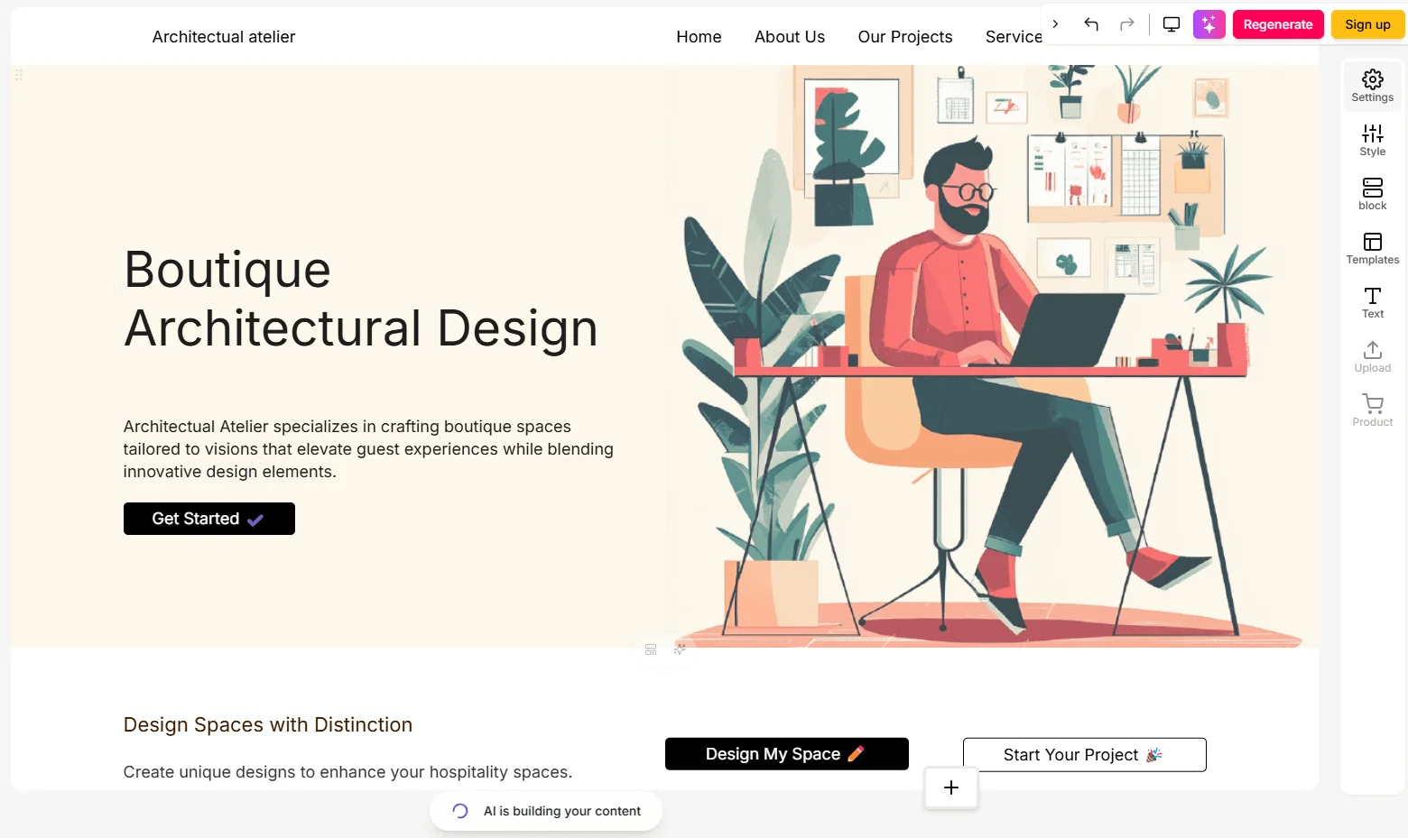 После генерации откроется редактор, в котором можно менять цвета, шрифты, добавлять блоки или обновлять отдельные секции.