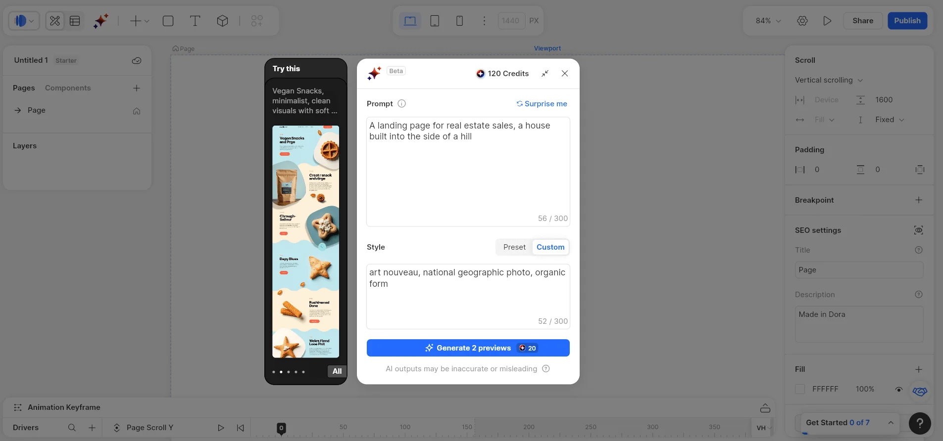 Dora объединяет редактор по типу Figma и сервис для генерации сайтов. Чтобы запустить ИИ-инструмент, нажмите на 3 цветные звездочки в левой верхней панели и введите промпт.
