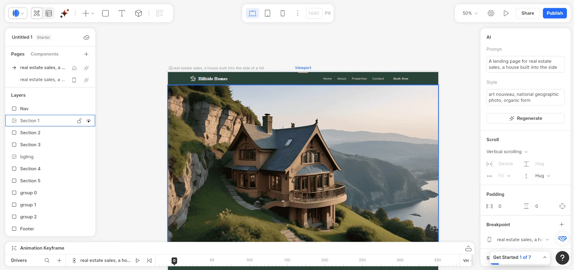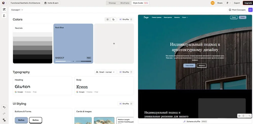 Чтобы разработать дизайн сайта, перейдите во вкладку Style Guide. Нейросеть предложит свои цвета, иллюстрации, шрифты и оформление кнопок. Чтобы изменить сгенерированную картинку, достаточно кликнуть на нее.