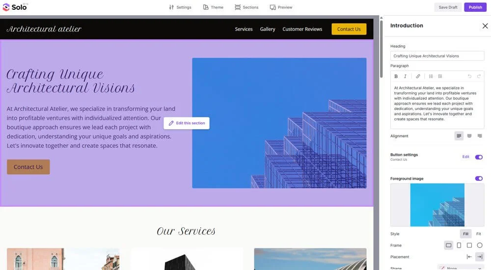 Solo — ИИ-сервис от Mozilla, который помогает быстро генерировать сайты. Перед началом работы нужно заполнить небольшую анкету о бизнесе. Как можно подробнее опишите задачу сайта и компанию, затем выберите шрифт, цветовую палитру и блоки.