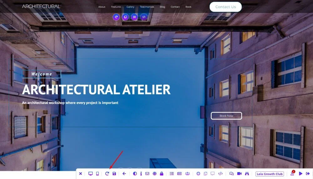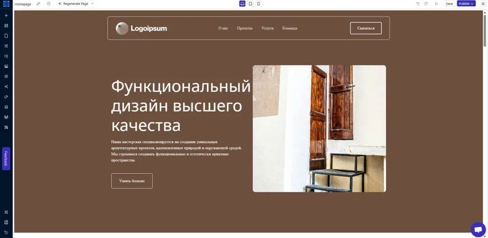 Leia генерирует сайт и сразу присваивает ему доменное имя. Сайт можно оставить как есть или отредактировать. На панели инструментов есть кнопка для повторной генерации дизайна, если не нравится первый вариант.