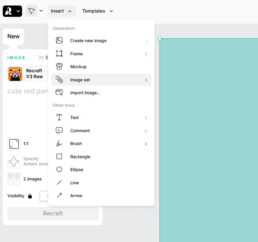 Нейросеть с кучей функций создания изображений под разные нужды. Интерфейс может показаться довольно сложным для новичка, функций и настроек в Recraft очень много. Но сделать стикеры несложно. Для этого в верхнем меню выберите Insert, затем — Image Set.