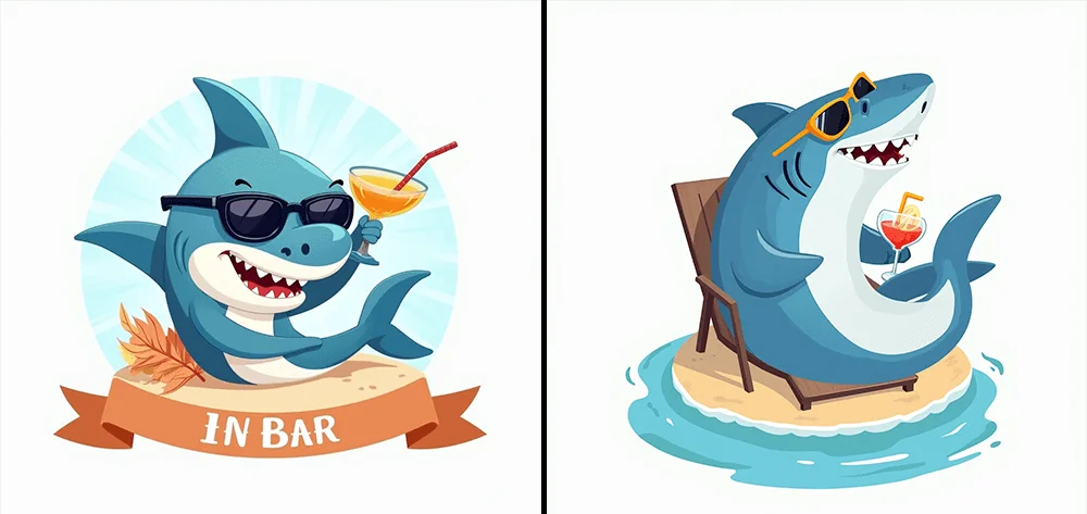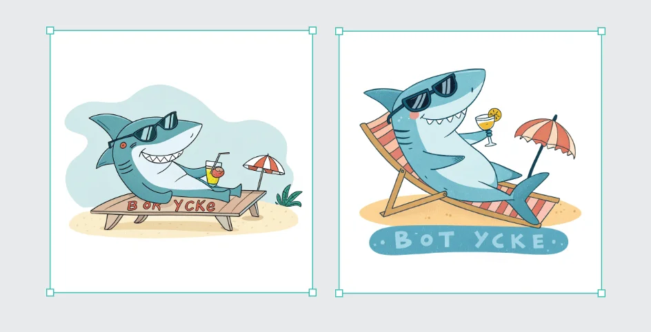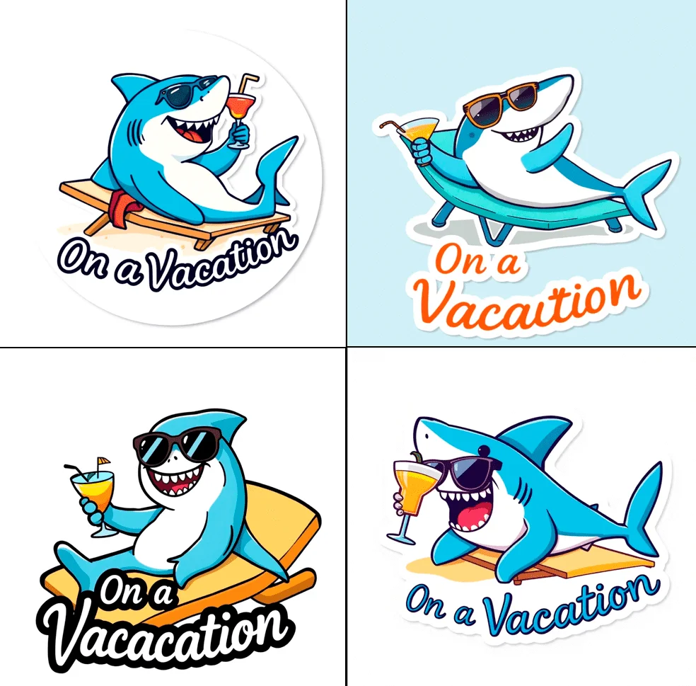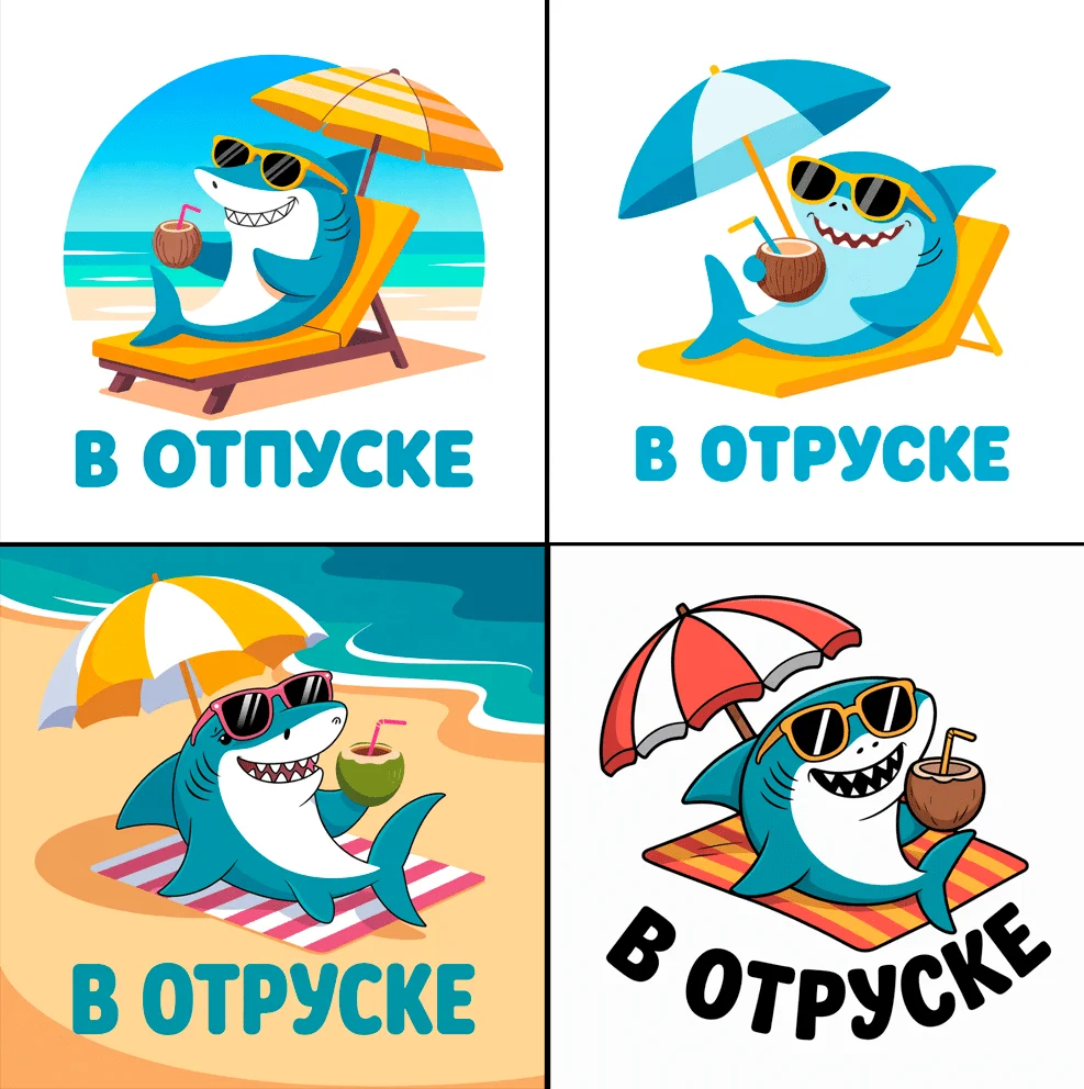 Чтобы проверить, как нейросеть справляется с русскоязычными запросами, переведём промпт на стикер с акулой: «Стикер для Telegram. Акула в мультяшном стиле на пляжном отдыхе, светло-голубого цвета (#4bbbe9), в расслабленной позе, в солнцезащитных очках, держит коктейль и лежит на шезлонге. Яркие плоские цвета, простые формы, прозрачный фон. Добавь изогнутую надпись под акулой с текстом ‘В ОТПУСКЕ’ жирным шрифтом в игривом стиле». Вот результаты: