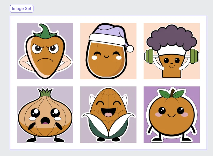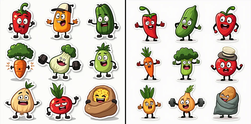 Проверим, справится ли нейросеть с целым паком стикеров. Используем промпт для генерации овощей, описанный в начале раздела.