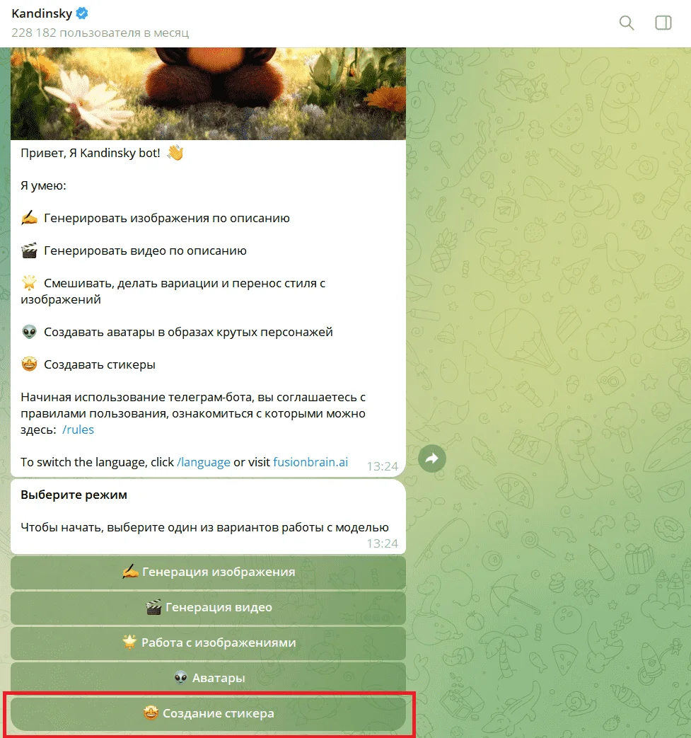 В боте Kandinsky в Telegram есть специальная функция для стикеров. Бот помогает сразу же добавить готовые изображения в новый или уже существующий стикерпак. Он работает как с русскоязычными запросами, так и с англоязычными.