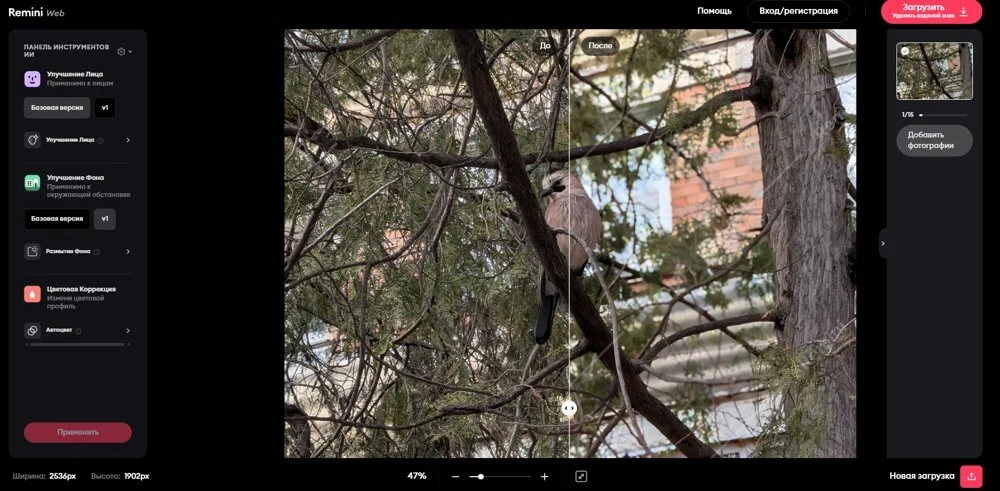 Улучшение низкокачественных изображений (Low Quality Enhancer). В отличие от инструмента «Увеличение изображения» не меняет размер, только повышает качество фото, убирает пикселизацию и артефакты. Стоит использовать, если картинка скачана в низком разрешении или сжата, и нужно сделать ее четче.