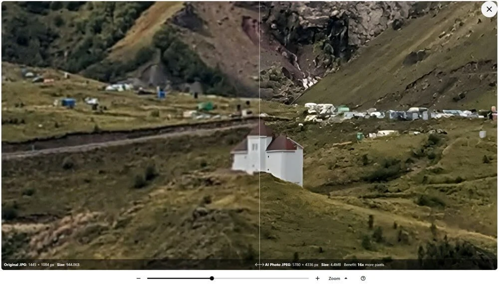 Сервис неплохо справляется с уменьшением шумов, повышением резкости и увеличением изображений. Можно приближать далекие объекты на фото — нейросеть сделает их четче.