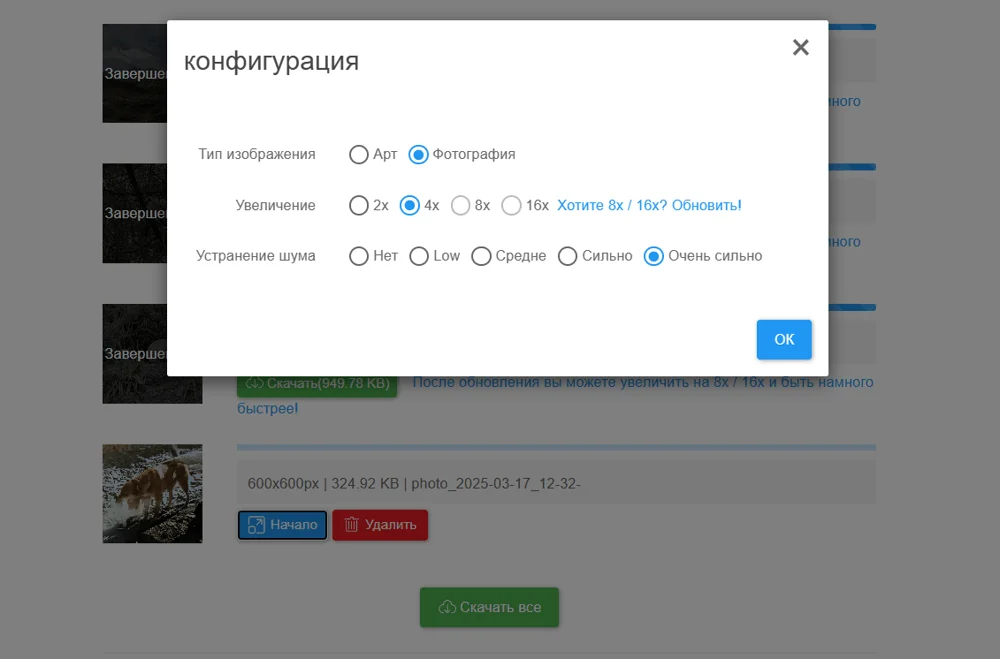 Нейросеть увеличивает изображения и при этом уменьшает количество шумов. Сервис работает так: нужно загрузить файл и выбрать параметры обработки. Указать, фото это или графическая картинка, во сколько раз нужно увеличить изображение и нужно ли убрать шум.