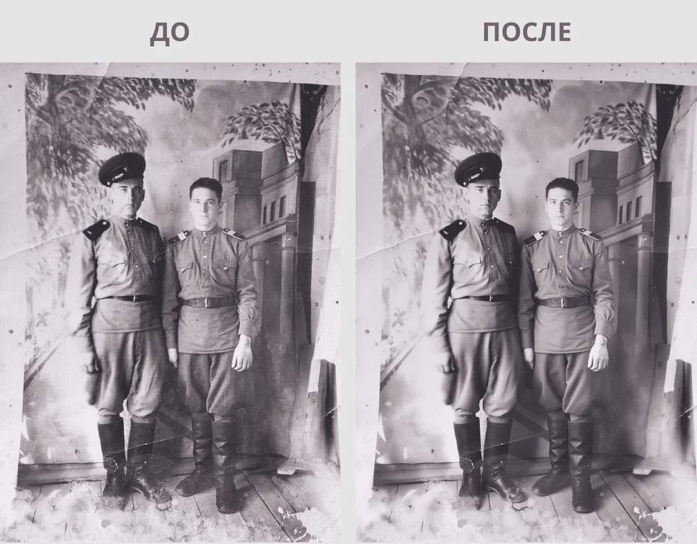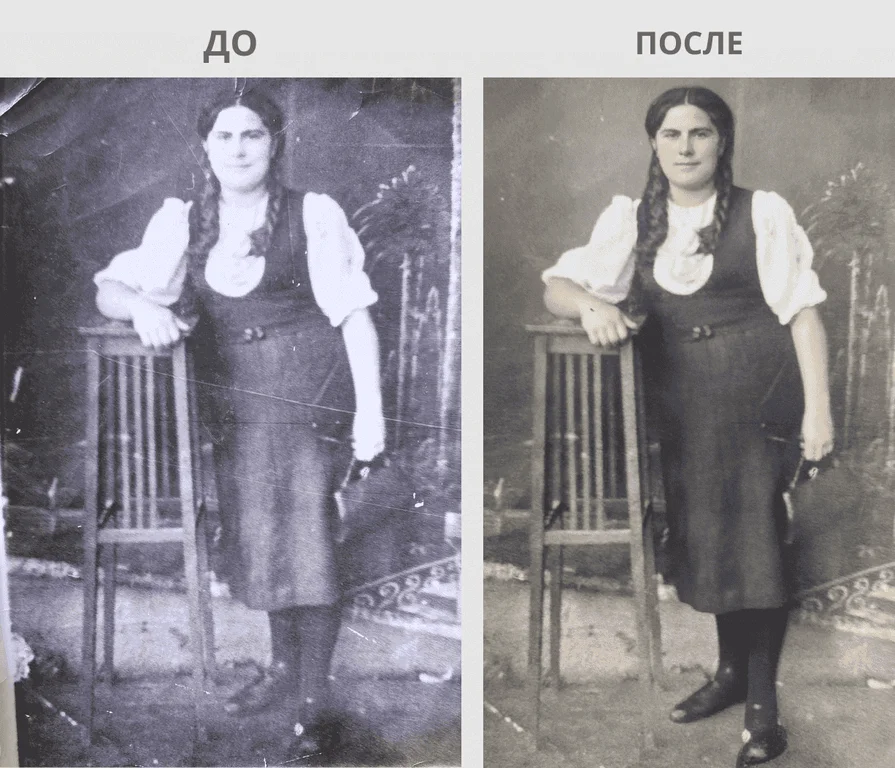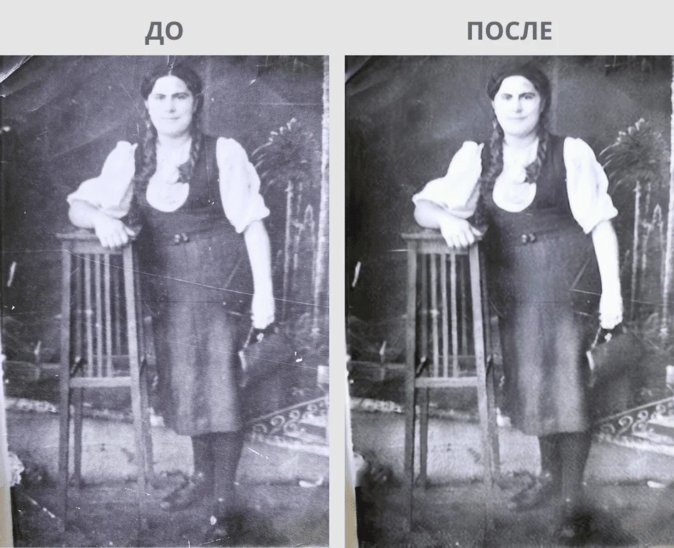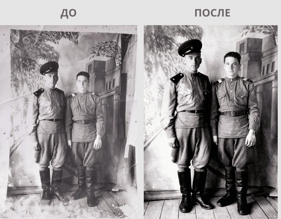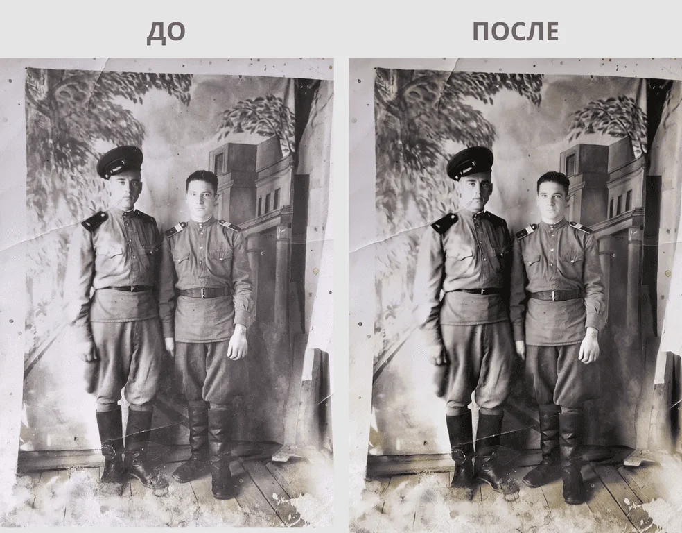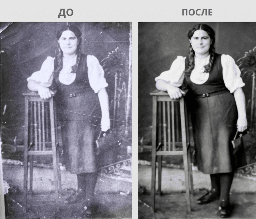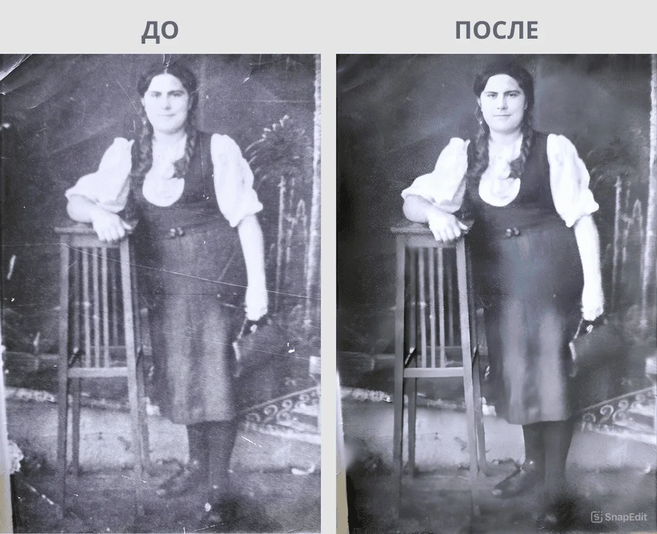 Мы отправили фотографии для восстановления с таким промптом: «Restore an old photo: remove scratches, stains, noise, tears, and fading. Even out tones and contrast, preserving original facial features and clothing details. Achieve the most natural results. Don't add new elements or change poses or facial expressions. Enhance sharpness, texture, clarity, and depth. Style: A realistic, accurate restoration».