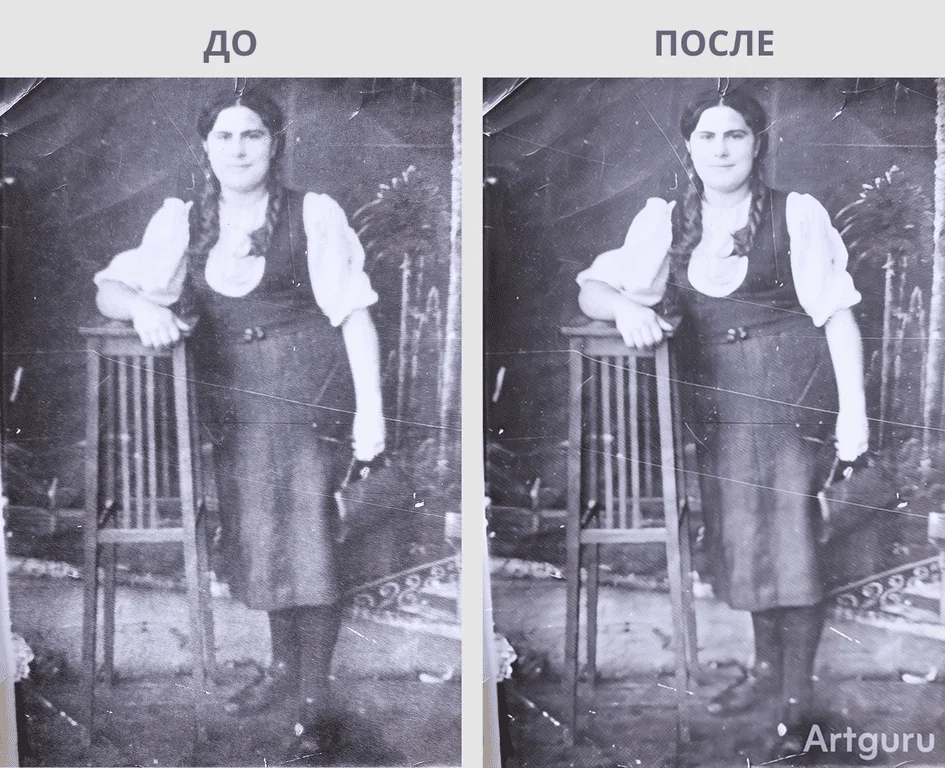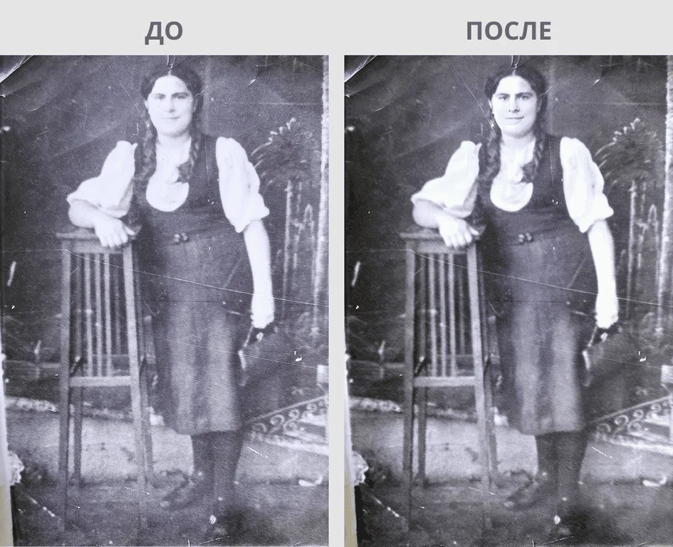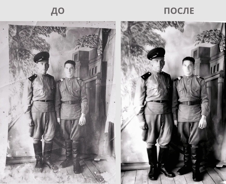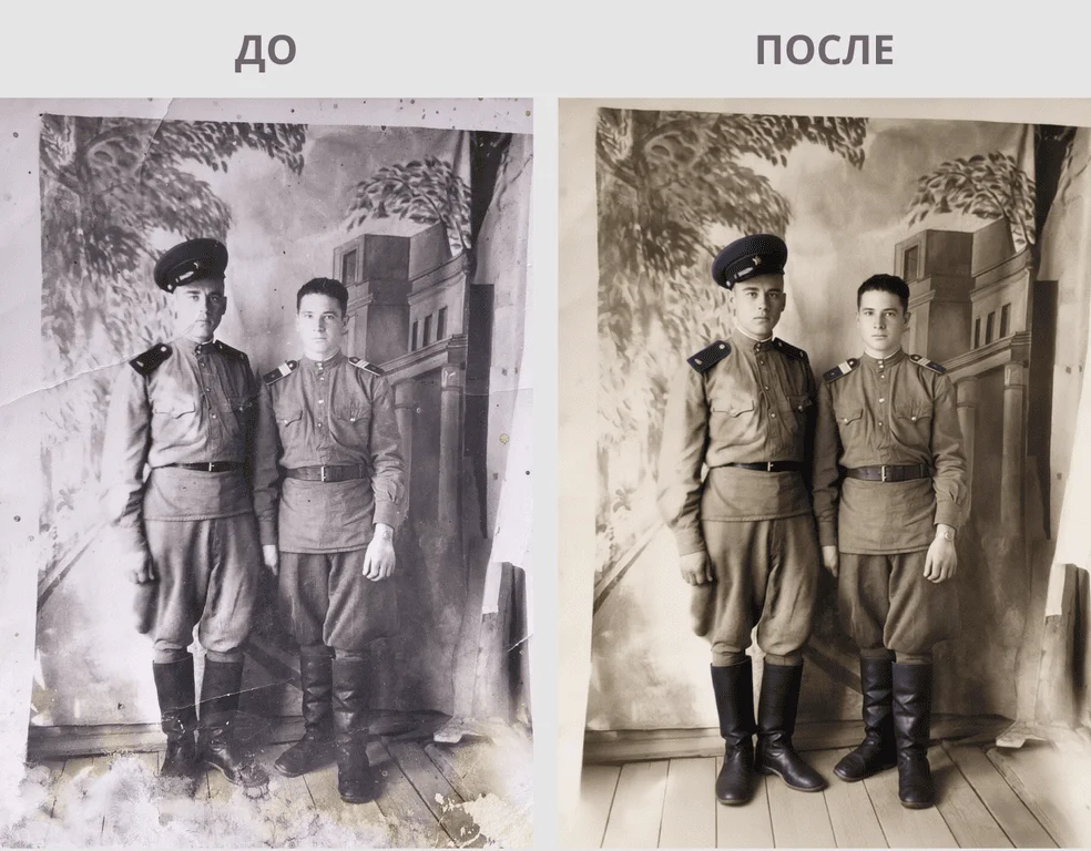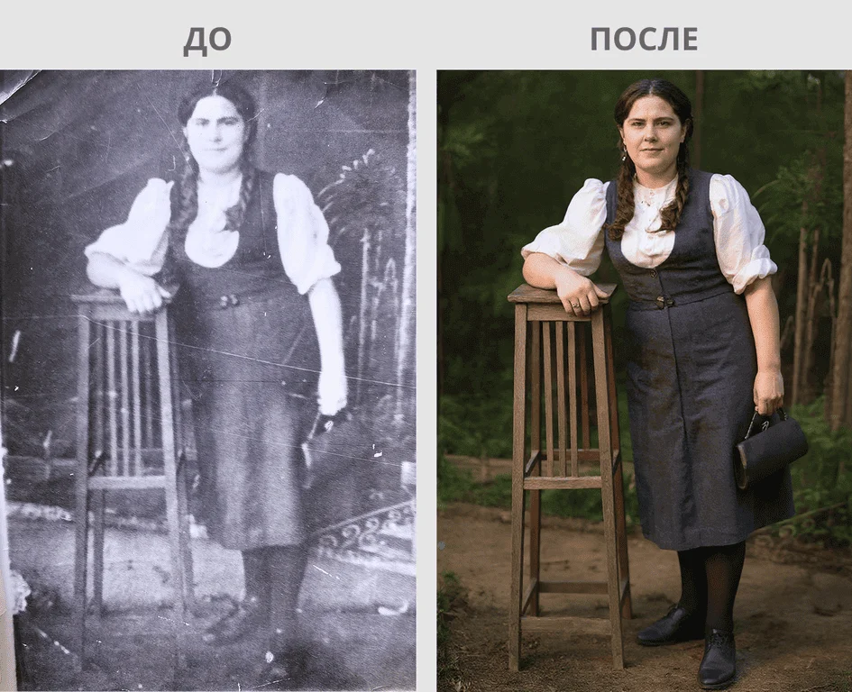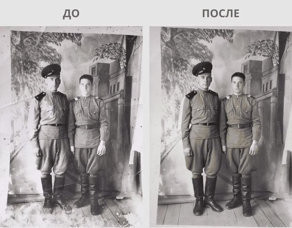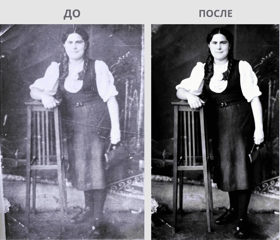 Мы отправили фотографии для восстановления с таким промптом: «Restore an old photo: remove scratches, stains, noise, tears, and fading. Even out tones and contrast, preserving original facial features and clothing details. Achieve the most natural results. Don't add new elements or change poses or facial expressions. Enhance sharpness, texture, clarity, and depth. Style: A realistic, accurate restoration».
