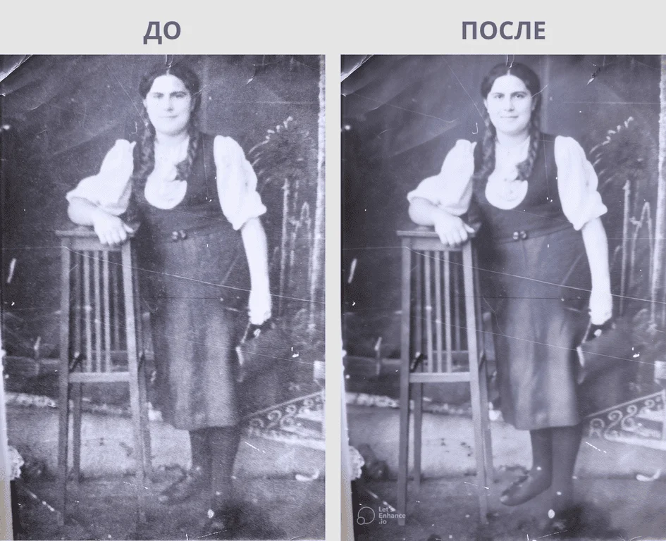 Это нейросеть для работы с изображениями. В том числе помогает восстановить и улучшить старые фотографии. Сервис уменьшает складки, сглаживает дефекты. В нем можно повышать резкость, яркость, четкость. Есть сценарии под разные типы снимков: портреты, пейзажи, архивные фото. Одновременно можно загружать до 50 фото.