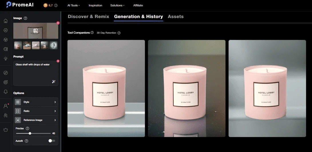 Работа с промптом не впечатлила: мы попросили стеклянную полку с брызгами воды для фона парфюма, но получили простой дефолтный фон.