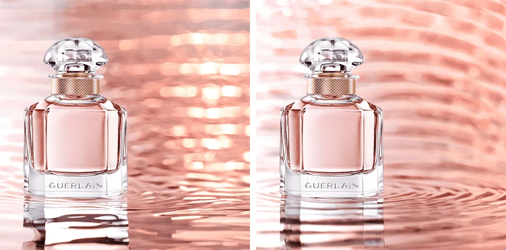 Мы протестировали тему «Розовая вода» для парфюма. Оба варианта получились почти одинаковыми, но в первом есть проблема с отражением флакона на водной поверхности.