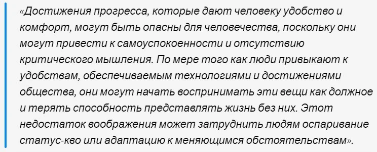 Нейросеть генерирует текст как ребенок в пубертате. Позволю себе метафору, поскольку я не айтишник. Алгоритмы научились строить ответы, базируясь на тезаурусе предметной области вопроса и общепринятого синтаксиса. На самом деле, это не ответы, а имитация ответов. Как говорит лингвист Ноам Хомский, современные нейронки — это Т9 на стероидах.