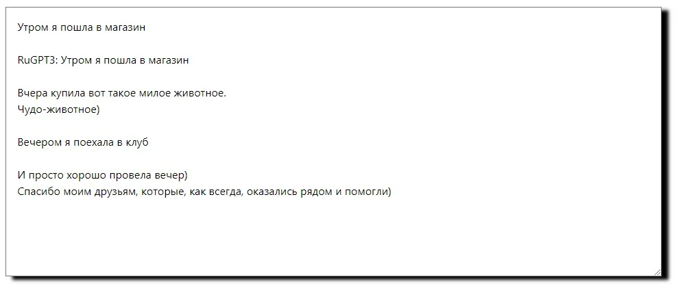 RuGPT-3. Это нейросеть от «Сбера», которая продолжает затравки пользователей. С нашей задачей сервис не справился от слова совсем. Видимо, информационные статьи он писать не умеет. Для чистоты эксперимента предложила нейросети еще одну затравку — «Утром я пошла в магазин». Здесь текст получился более логичным, хотя смысл явно страдает. Ну кто идет в магазин, чтобы купить «чудо-животное»?