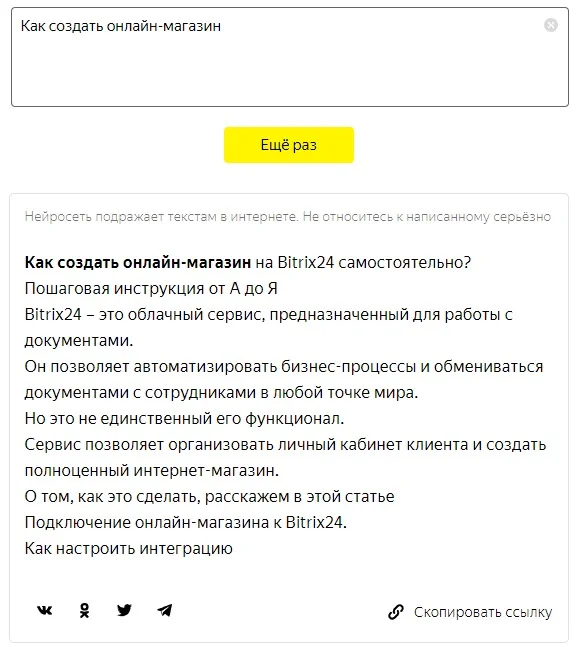 «Балабоба». А это сервис «Яндекса», который с задачей справился неплохо: уточнил мой запрос, добавил подзаголовок, сохранил инфостиль, написал приличную подводку к статье. Только в конце ушел не туда. Мне нужна инструкция, как создать магазин с нуля, а «Балабоба» в первом разделе статьи хочет рассказать, как подключить уже готовый магазин к Bitrix24.