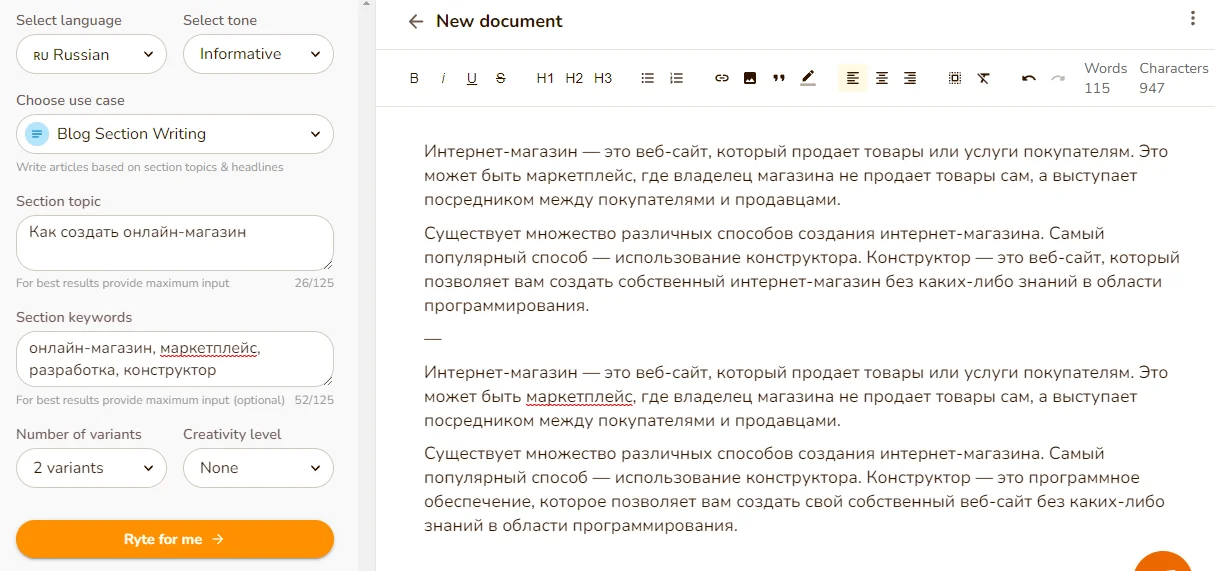 Rytr. Это иностранный сервис, который работает в том числе и с русским языком. Здесь есть тонкие настройки: можно выбрать тип контента, указать ключевые слова, тон, уровень креативности, количество вариантов. На наш запрос нейросеть написала два приличных текста, которые можно доработать и использовать как введение к статье или начало раздела в большой инструкции.
