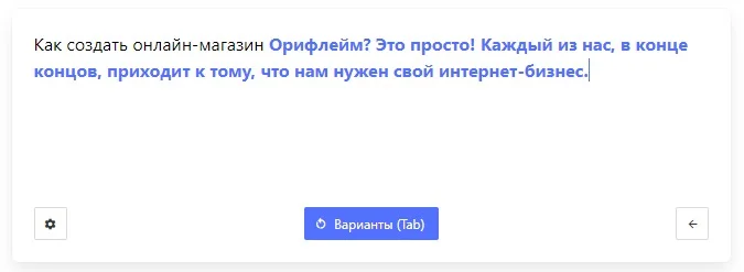 «Порфирьевич». Как и в нейросетях от «Яндекса» и «Сбера» здесь нет никаких тонких настроек: пишешь затравку — сервис на ее основе генерирует текст. Все тексты укладываются в пару строчек и выглядят скорее как слоганы или планы будущих статей. Как самостоятельную единицу контента такое использовать точно нельзя.