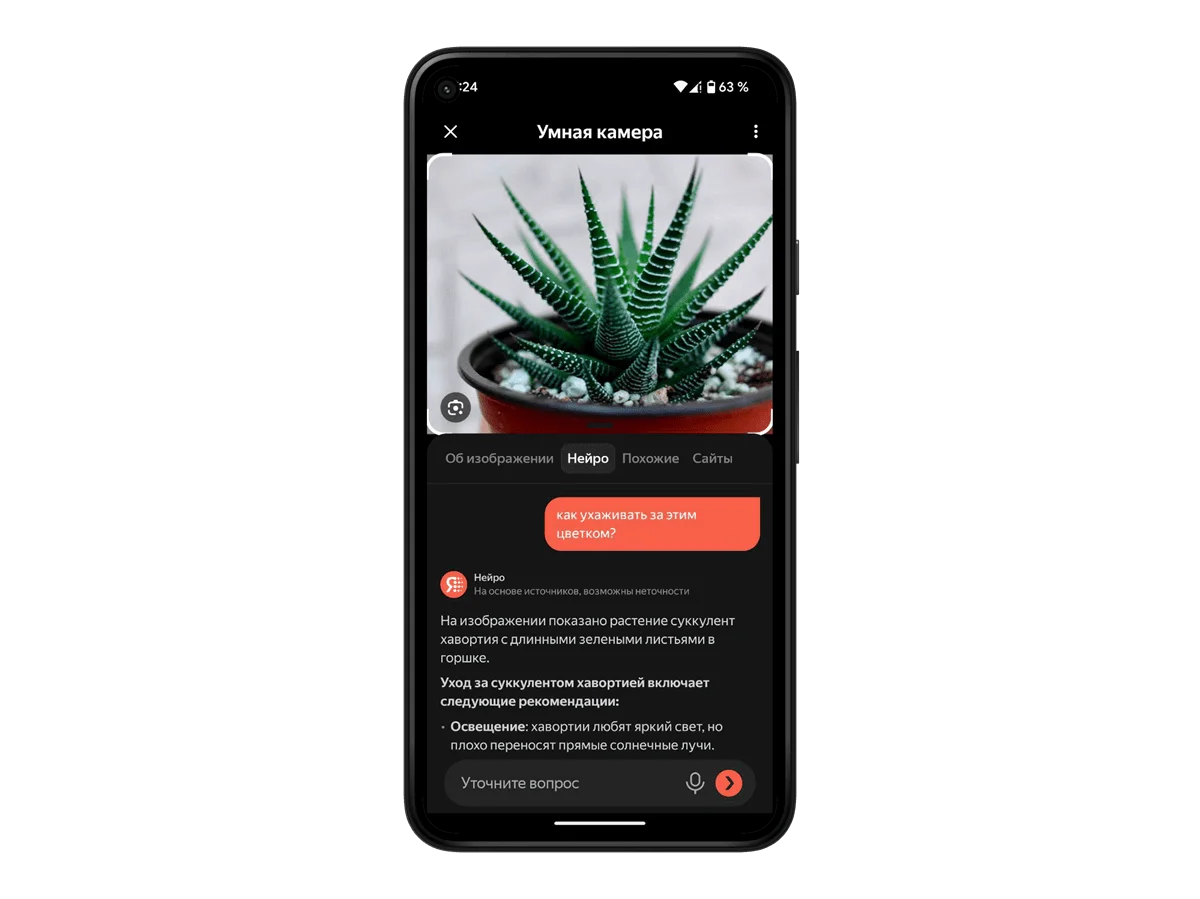 В мобильном приложении Яндекс Браузера можно общаться с Нейро через картинки. Например, отправьте ему фото домашнего растения и спросите, как за ним ухаживать.