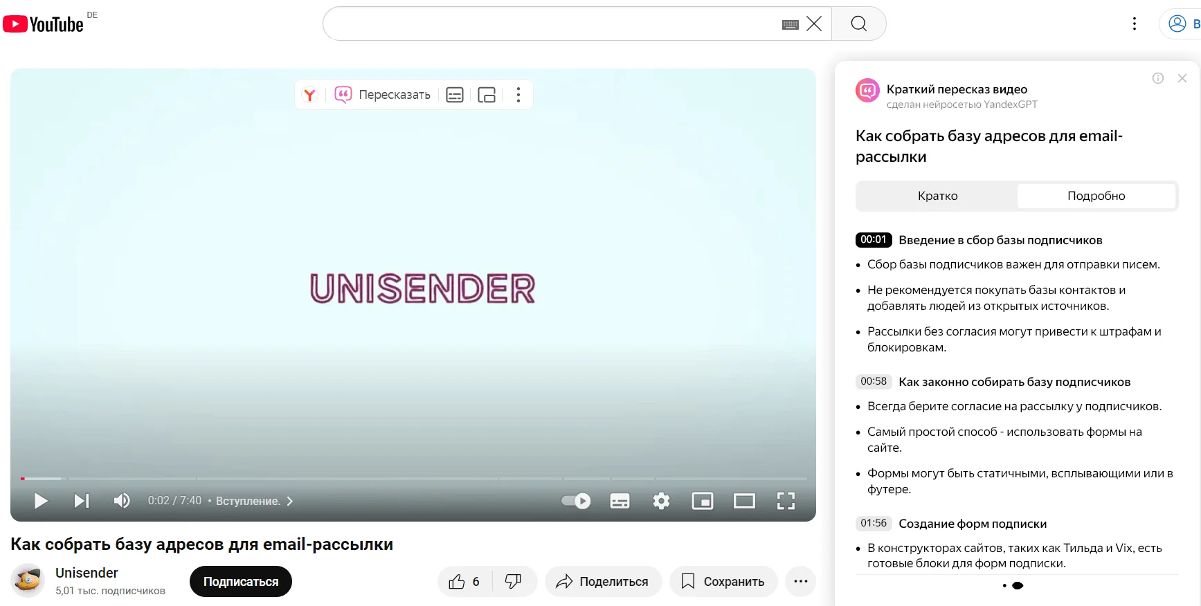 300ya встроен в Яндекс Браузер и может пересказывать видео на YouTube или статьи на других платформах. Справа от адресной строки появляется кнопка «пересказать» — нажмите ее и получите тезисную выжимку. На YouTube эта кнопка появляется поверх видео.